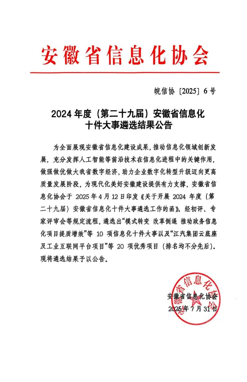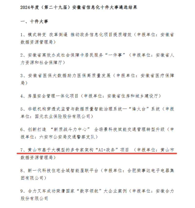 7月31日,安徽省信息化协会正式公布 2024 年度(第二十九届)安徽省信息化十件大事遴选结果。由龙讯提供技术支持的黄山市基于大模型的多专家架构 “AI + 政务” 项目,历经多轮严格专家评审,在全省众多申报项目中脱颖而出,成功入选2024年度(第二十九届)安徽省信息化十件大事。这一成果不仅是对黄山市信息化建设的肯定,更彰显了人工智能技术在政务服务领域的深度应用价值。