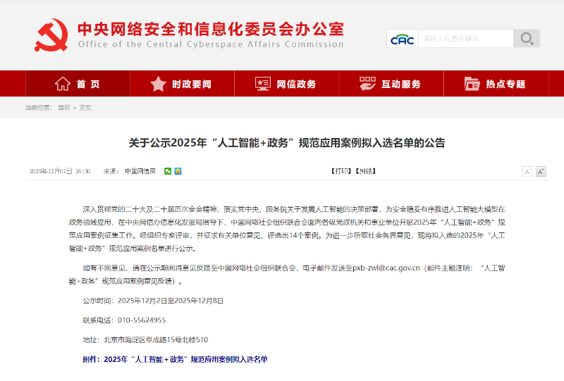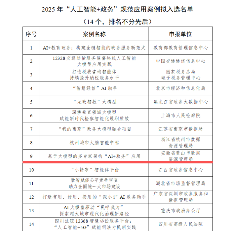 日前,中央网信办信息化发展局指导、中国网络社会组织联合会组织评选2025年“人工智能+政务”规范应用案例,黄山市“基于大模型的多专家架构‘AI+政务’项目”成功入选,是我省唯一入选的“人工智能+政务”项目。2025年9月,黄山市“AI+政务”项目获评2025世界制造业大会“安徽省信息化十件大事”。本次入选中央网信办“人工智能+政务”规范应用案例,标志着黄山市“AI+政务”项目,已成为引领全国“人工智能+政务”项目的标杆之一。
