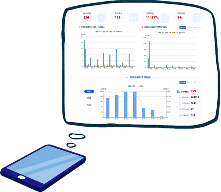 将全市政府系统微博、微信、抖音、头条等236个政务新媒体账号,按照层级、主题、类型纳入矩阵式集中管理,构建协调统一、上下联动、响应迅速的全市政务新媒体矩阵体系。